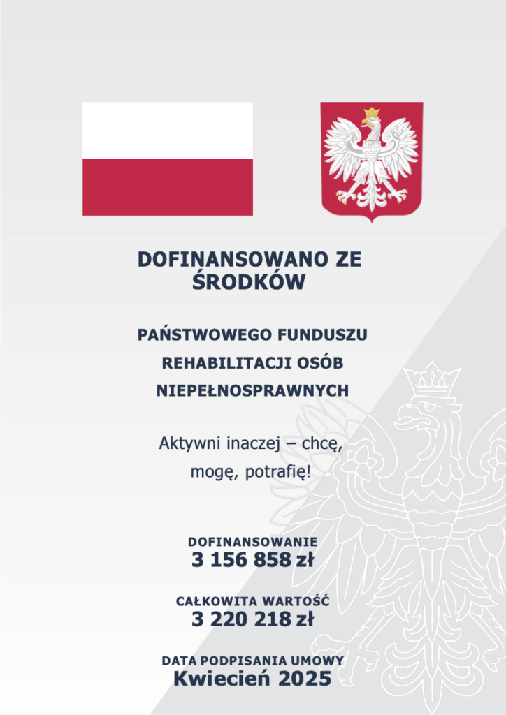 Projekt: „Aktywni inaczej – chcę mogę potrafię!” współfinansowany ze środków PFRON w ramach konkursu 1/2024 pod nazwą „Wspieramy aktywność” w ramach umowy nr UM/PW9/2025/3/O_MALOPOLSKI/12365, o zlecenie realizacji zadań na podstawie art. 36 ustawy o rehabilitacji zawodowej i społecznej oraz zatrudnianiu osób niepełnosprawnych ze środków PFRON.